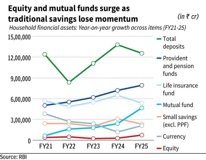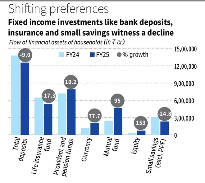 RBI’s monthly bulletin shows that bank deposits held by households fell by 8.97 per cent to ₹12.54 lakh crore in FY25, reversing the growth seen over the previous two years. Investments in life insurance funds declines 17.3 per cent to ₹5.3 lakh crore and small savings (excluding PPF) dipped 24 per cent. These safe investments, which give relatively lower returns seem to have been spurned by investors.