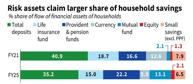 This shift is also evident in the composition of household financial assets. The share of bank deposits in overall financial savings fell from 40.9 per cent in FY21 to 35.2 per cent in FY25. While mutual funds expanded their share from just 2.1 per cent to 13.1 per cent over the same period. Equity holdings, though relatively small, also increased their share from 1.3 per cent to 2.1 per cent.